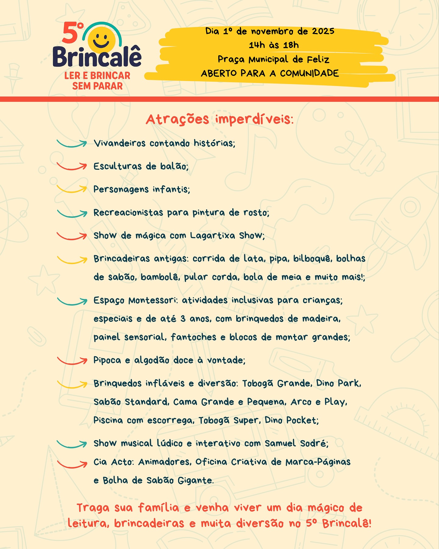 O Brincalê já tem nova data marcada. O evento, que estava inicialmente previsto para o dia da criança e que foi adiado devido a instabilidade do tempo, será neste sábado, 1º de novembro. Promovido pela Secretaria de Educação e Desporto de Feliz, terá uma tarde de diversão, aprendizado e convivência na Praça Municipal Lidovino Antônio Fanton, com muitas brincadeiras, atividades e diversão para as crianças e suas famílias.