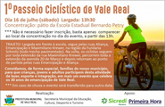 Uma atividade para integrar pais e filhos. É com esse objetivo que está programado para o dia 16 de julho, sábado da semana que vem, à tarde, o 1º Passeio Ciclístico de Vale Real. A programação é uma iniciativa do município, através da Secretaria Municipal da Educação, Cultura, Desporto e Turismo, Conselho Municipal do Turismo e apoio do jornal Primeira Hora e da Cooperativa Sicredi Pioneira.