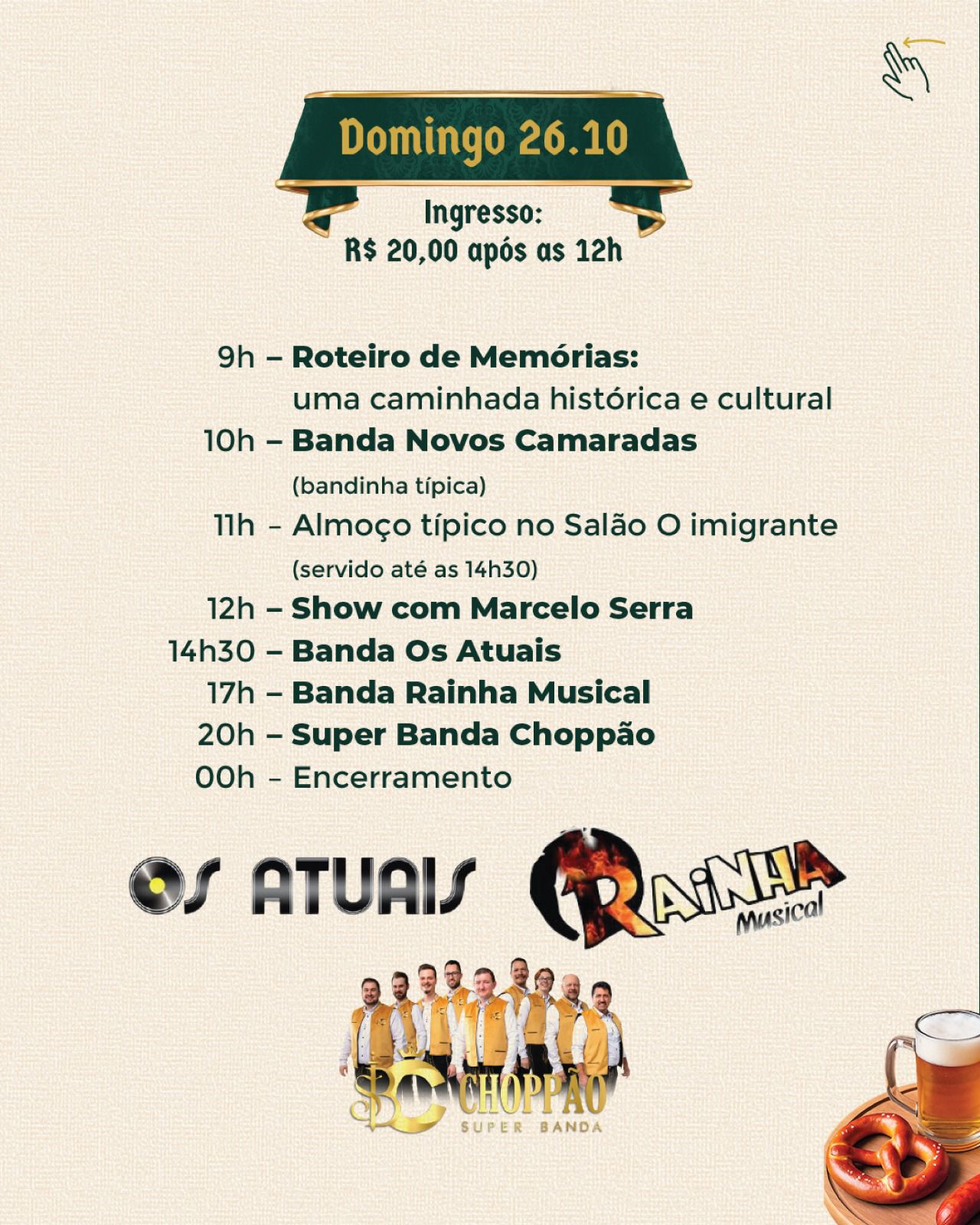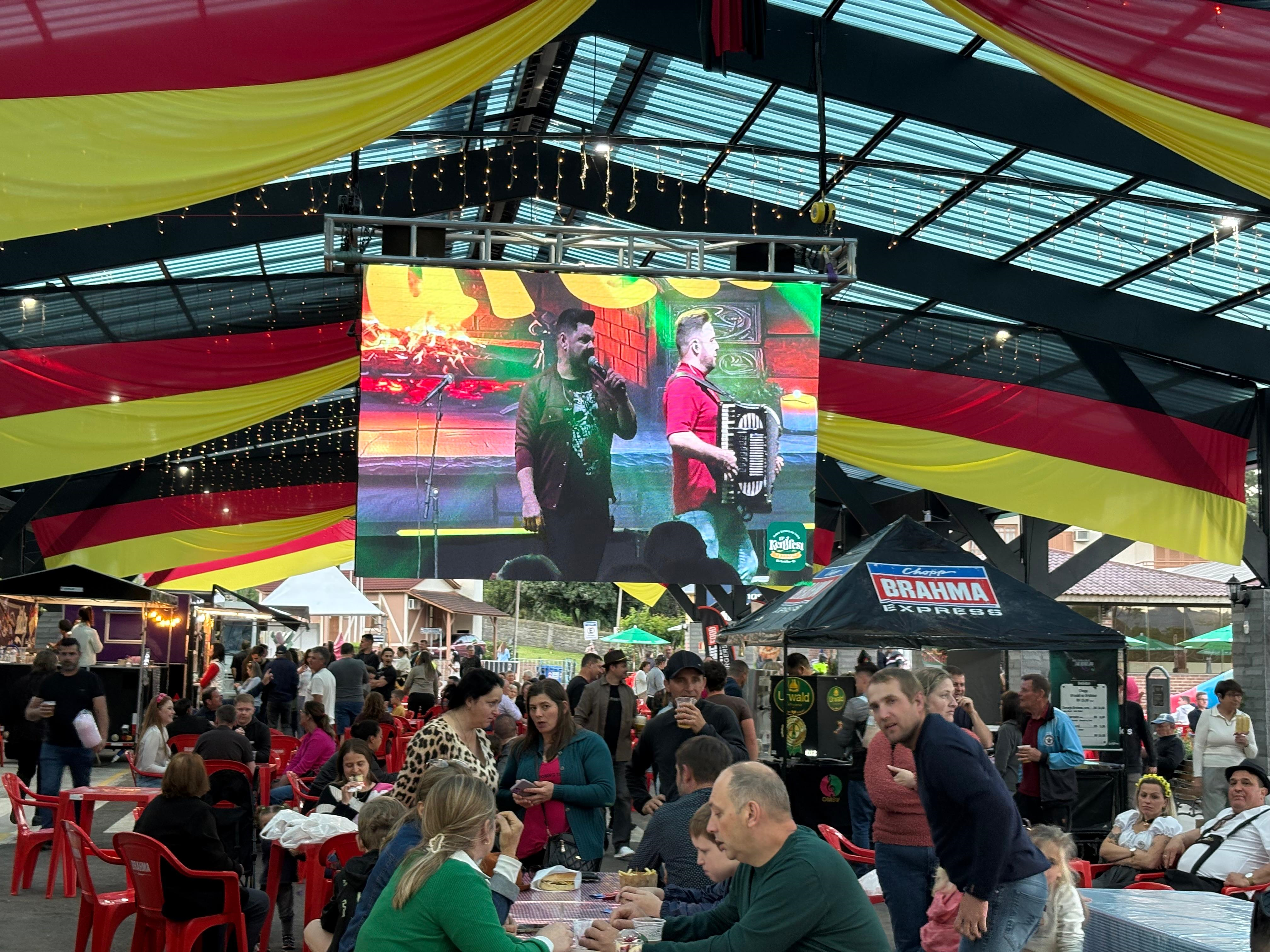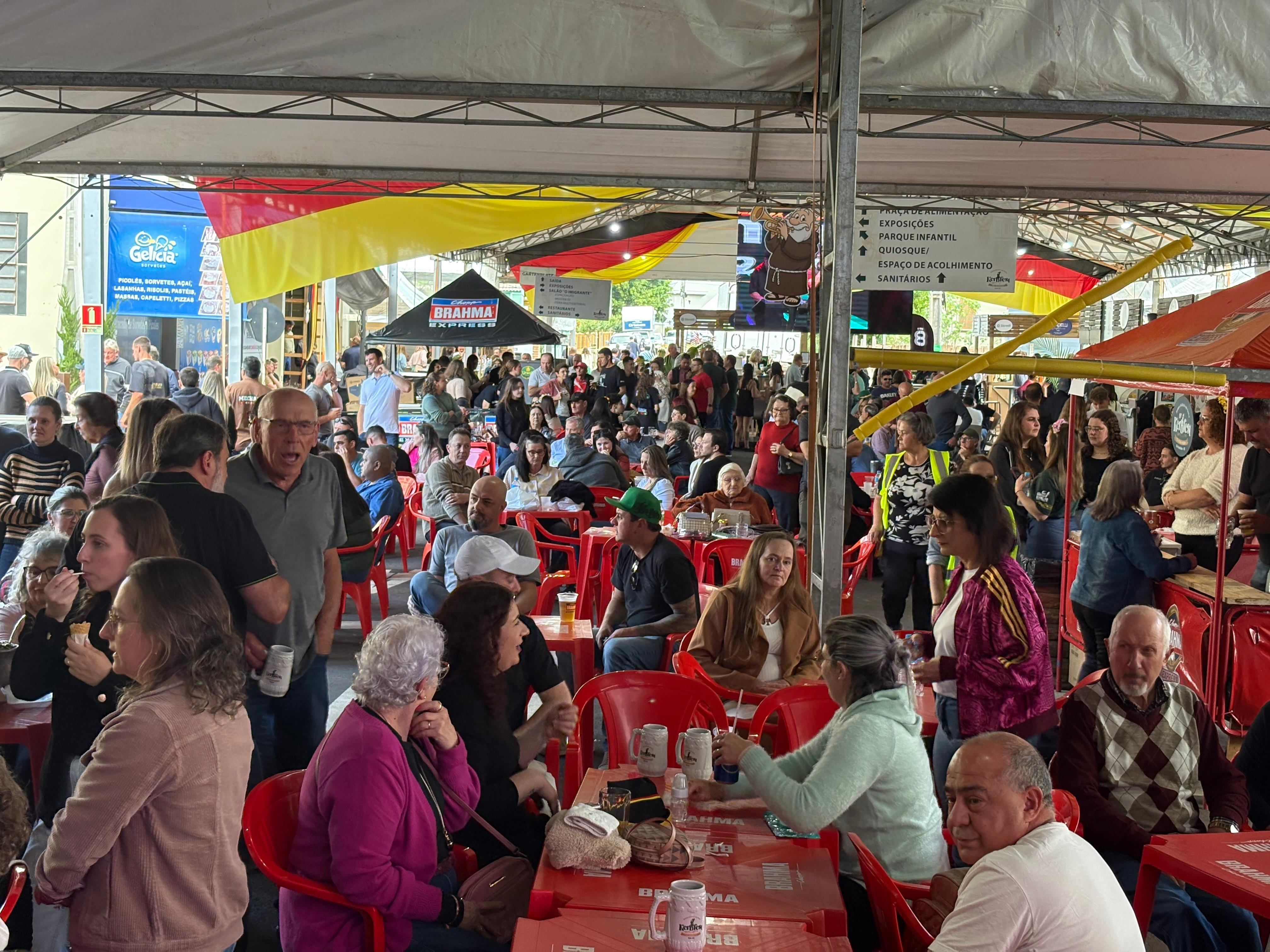 A programação segue agitando todas as idades, unindo gastronomia, cultura e diversão em mais de 5 mil metros quadrados de área coberta. O centro da cidade se transformou em um grande complexo de pavilhões, onde o público pode saborear cucas, chucrute, schweinshaxe, pães, pretzels, sobremesas coloniais e pratos artesanais, todos preparados com o carinho e o sabor característicos da comunidade vendelinense.
