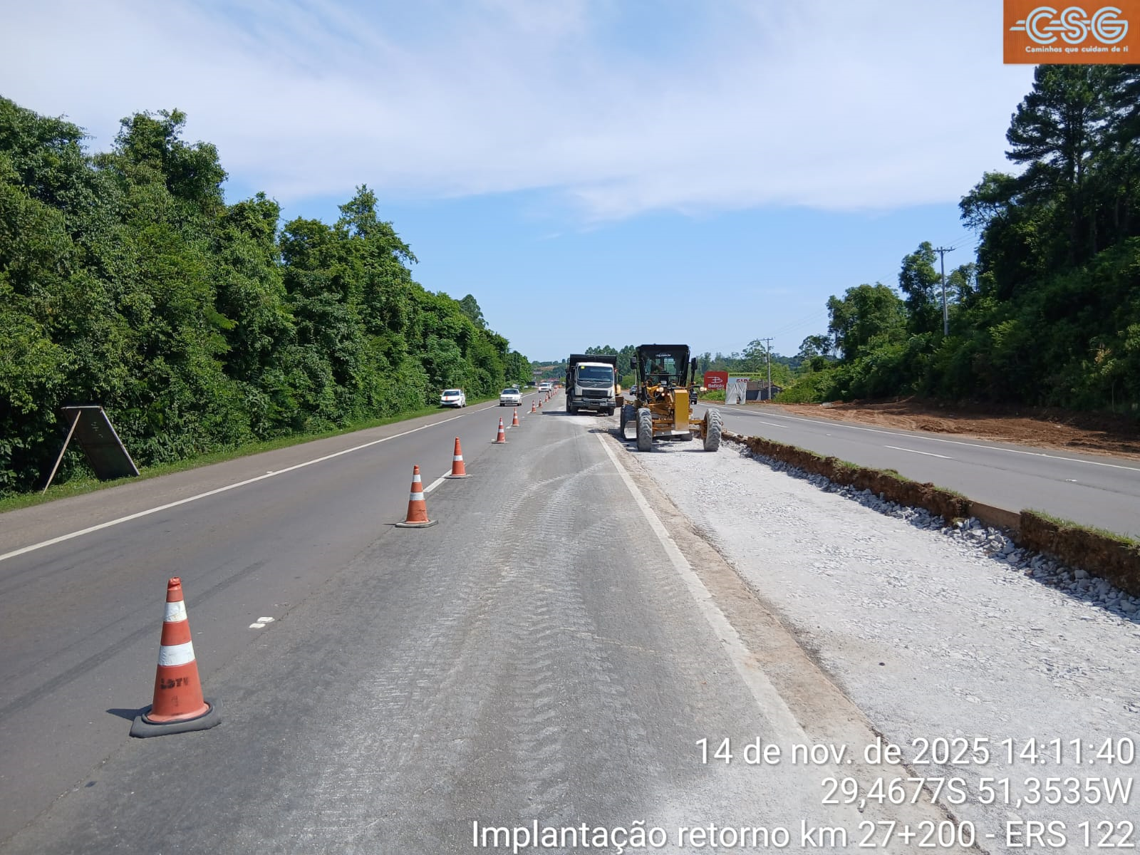 A CSG informa que iniciou as obras para implementação de um retorno no km 27,7 da ERS-122, sentido interior-capital, próximo ao posto da Polícia Rodoviária Estadual (PRE), em Bom Princípio. Os trabalhos iniciaram nesta semana e tem previsão de conclusão até o final do mês de novembro. Durante o período da intervenção, haverá no local estreitamento de pista das 7h às 18 horas.
