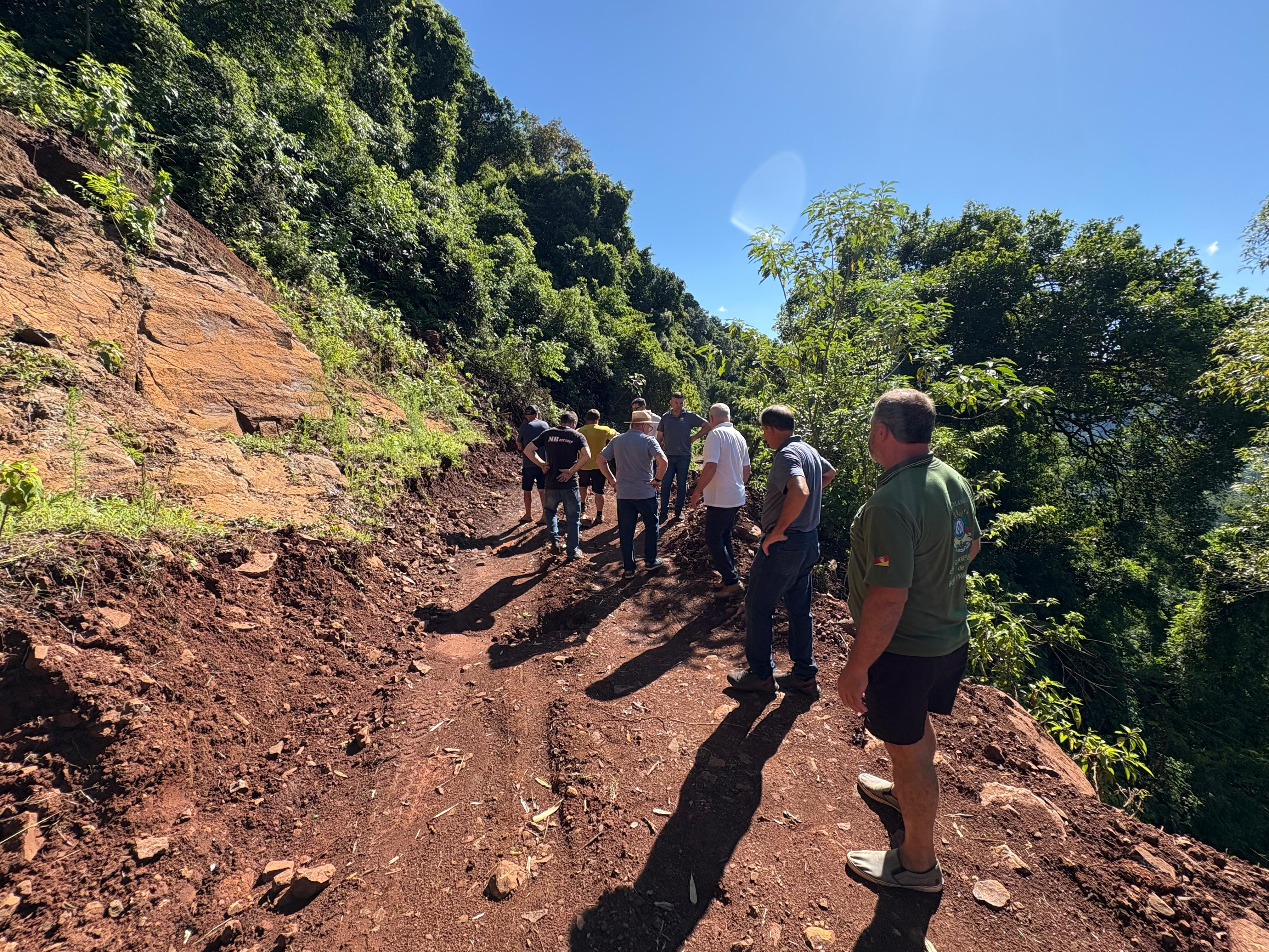 Os cerca de 2 quilômetros de estrada de chão que ligam o Morro Carrard até a Linha Floriano Peixoto por meio da mata foram percorridos a pé por equipes técnicas de São Vendelino e Bom Princípio na última terça-feira. Secretários de Obras, equipe de engenharia, geólogo, Defesa Civil, moradores do entorno, e o prefeito são-vendelinense Régis Fritzen e o vice-prefeito Luizinho Liell, de Bom Princípio, acompanharam o grupo para avaliar a viabilidade de restaurar essa estrada de chão de maneira correta e segura.