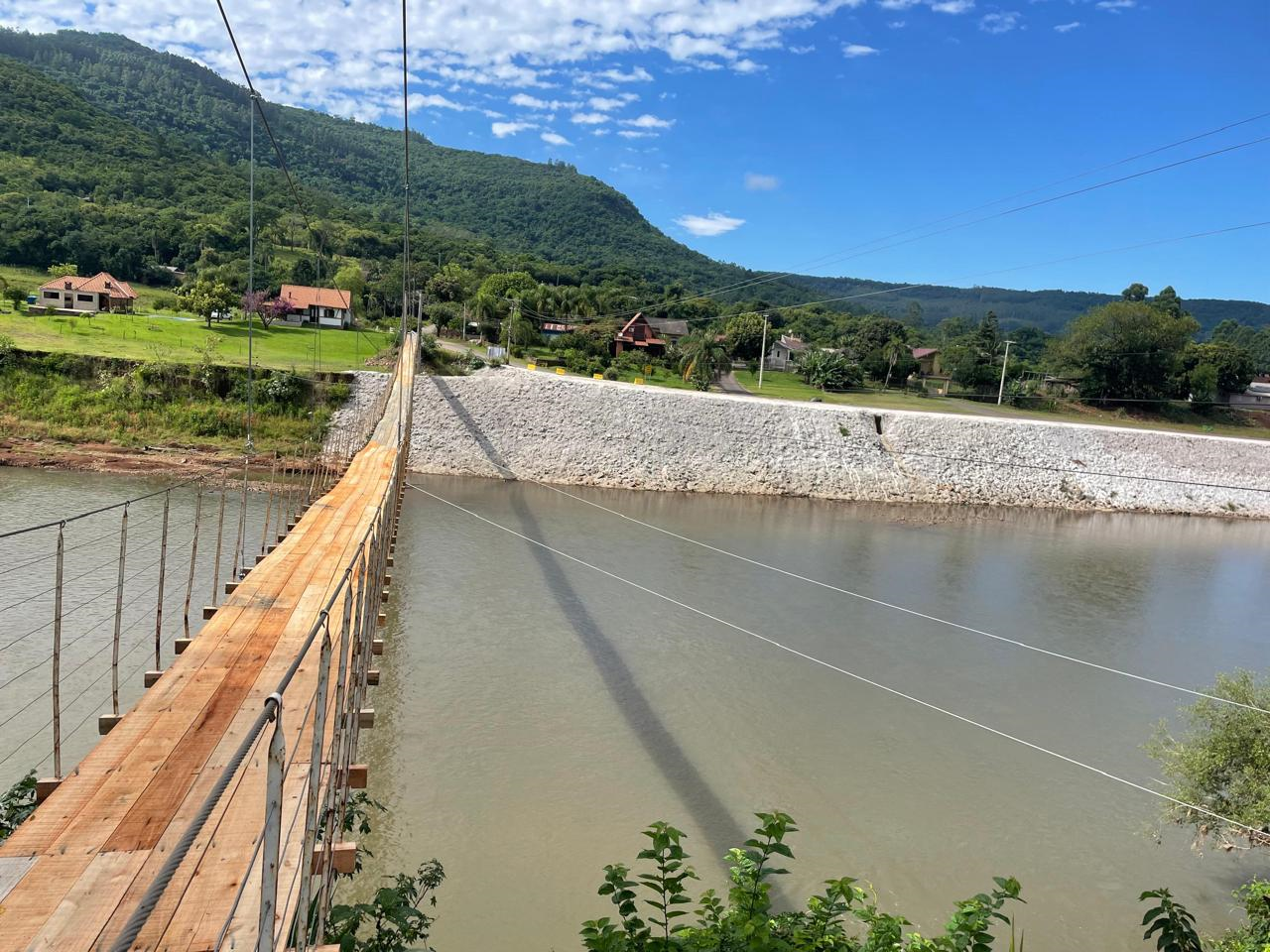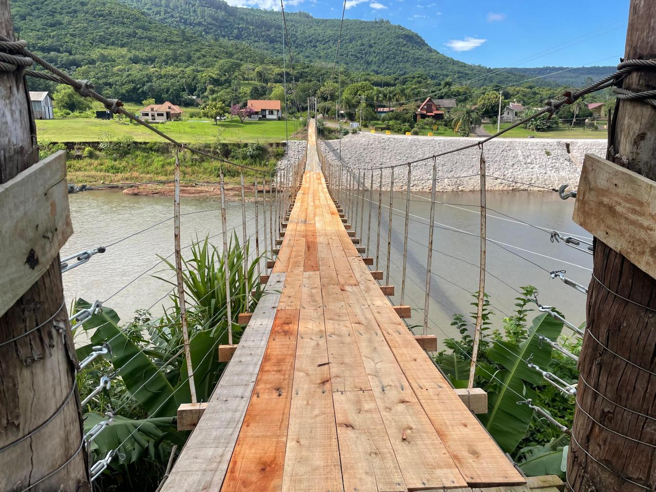 Após uma completa reforma, a ponte pênsil entre Vale Real e Bananal (Feliz) está novamente liberada para uso da comunidade. Além da colocação de uma nova base de madeira para compor o leito, foram instalados cabos de aço do meio da travessia em direção às margens. Essa medida busca oferecer mais segurança e estabilidade à pinguela, evitando que a força do vento volte a causar danos.