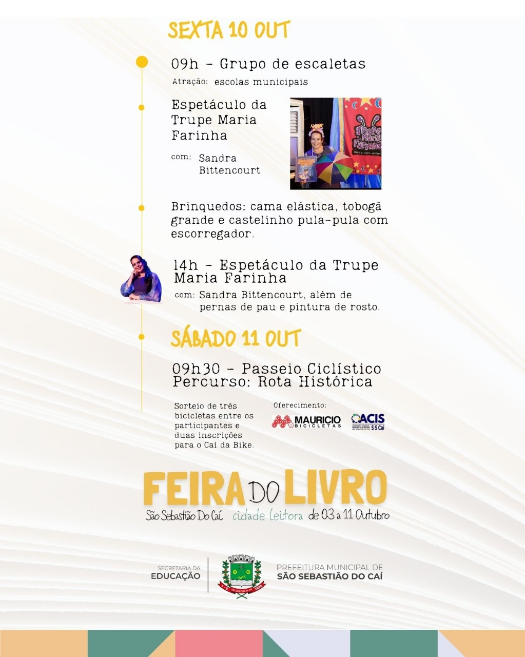 Nesta sexta-feira, dia 10, a partir das 9h, tem Grupo de Escaletas com Espetáculo da Trupe Maria Farinha e brinquedos. Já no sábado, a partir das 9h30 tem Passeio Ciclístico.