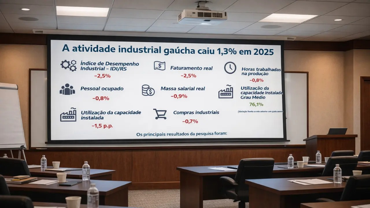A atividade industrial gaúcha registrou retração de 1,3% no acumulado de 2025. O índice foi apontado pela pesquisa divulgada pelo Sistema da Federação das Indústrias do Rio Grande do Sul (Fiergs). O resultado decorre principalmente da redução no faturamento real e nas compras do setor, além de fatores como juros elevados, incertezas fiscais e diminuição das exportações em razão de tarifas impostas pelos Estados Unidos da América. Os dados integram o ‘Índice de Desempenho Industrial do Estado’ (IDI-RS), que acompanha o comportamento da área ao longo do ano e funciona como um termômetro das operações das indústrias gaúchas. Entre as variáveis consideradas na pesquisa estão: faturamento, compras, horas trabalhadas, massa salarial, utilização da capacidade instalada e emprego.