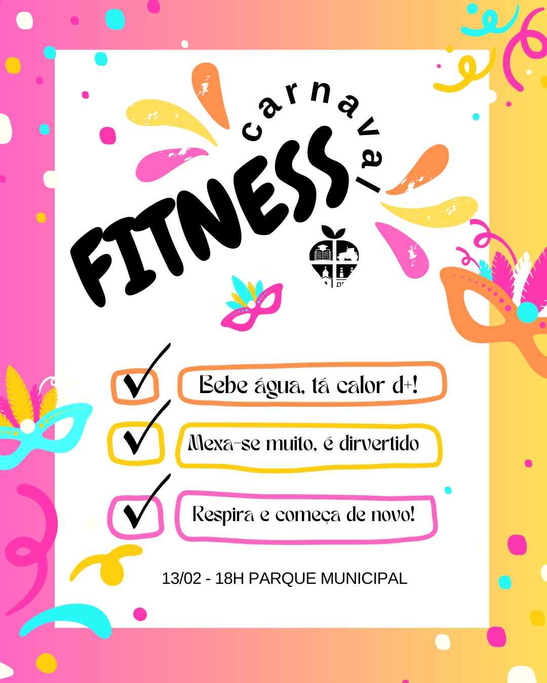 Bom Princípio terá o Carnaval Fitness. Será nesta sexta-feira, dia 13, a partir das 18h, no Parque Municipal, visando incentivar o bem-estar, a prática de atividade física e a convivência comunitária. O evento estará aberto à comunidade, sem a necessidade de se inscrever. É só comparecer com roupa adequada, levar garrafinha de água e participar. E na semana seguinte, dia 21 acontece o Sábado na Praça, com banda, brinquedos infláveis e praça de alimentação.