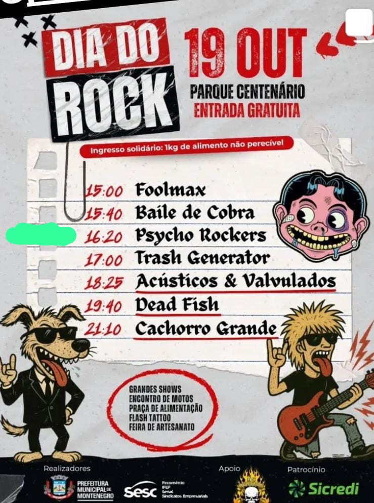 Já na Festa do Dia do Rock terão grandes shows de bandas como Dead Fish, Cachorro Grande e Acústicos & Valvulados, além de Baile de Cobra, Foolmax, Psycho Rockers e Trash Generator. E também encontro de motos, praça de alimentação, Flash Tattoo e Feira de Artesanato. Ingresso solidário de 1kg de alimento não perecível.