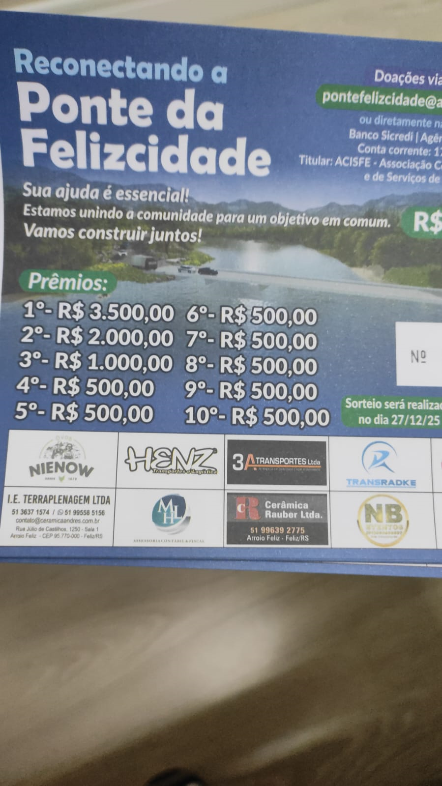 Nesta quarta-feira, dia 4, foram retomados os trabalhos para a conclusão da ponte da Felizcidade, entre Arroio Feliz e Picada Cará, em Feliz. Está sendo feita a pintura da sinalização para depois serem fixados os tachões. E ainda falta a concretagem das cabeceiras. Ainda não se tem uma previsão para a finalização e inauguração. Vai depender da arrecadação de mais recursos, já que faltam cerca de R$ 60 mil para a conclusão do serviço e a entrega da obra, permitindo o trânsito de veículos. A campanha para as obras continua, tanto com a rifa como com as doações por pix para a chave pontefelizcidade@acisfe.com.br. Os bilhetes da rifa ainda podem ser adquiridos na ACISFE, com voluntários da obra ou junto ao Clube de Mães de São Roque.